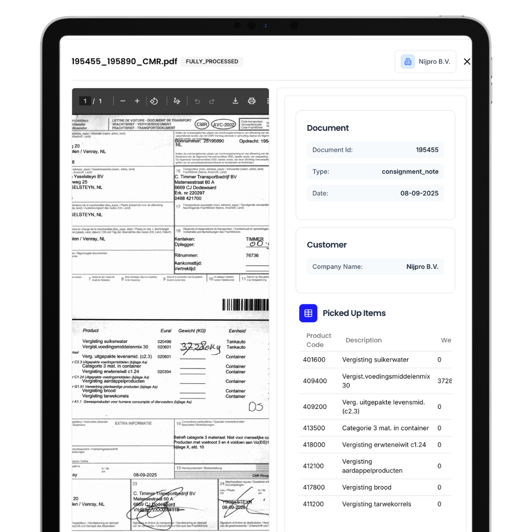 Nijsen is een innovatief familiebedrijf in de maakindustrie. Ze verwerken reststromen uit de voedingsmiddelenindustrie tot hoogwaardig veevoer. Een belangrijk onderdeel van hun operatie is het verwerken van vrachtbrieven (CMR’s). Deze documenten kwamen dagelijks handgeschreven binnen en moesten volledig handmatig ingevoerd en gecontroleerd worden in Talis (TMS). Een tijdrovend en frustrerend proces.
